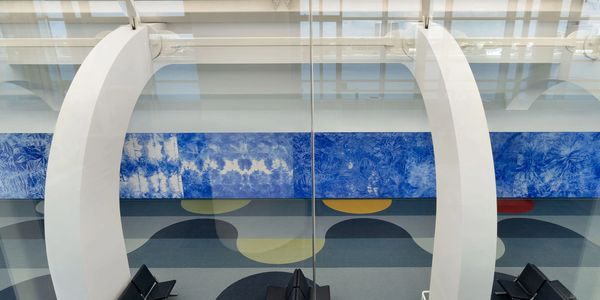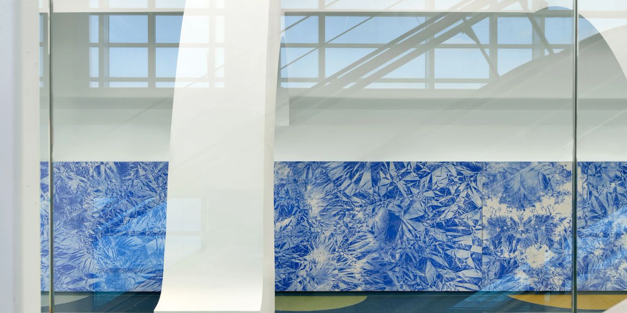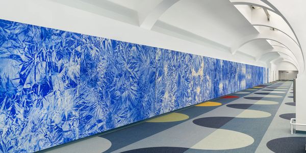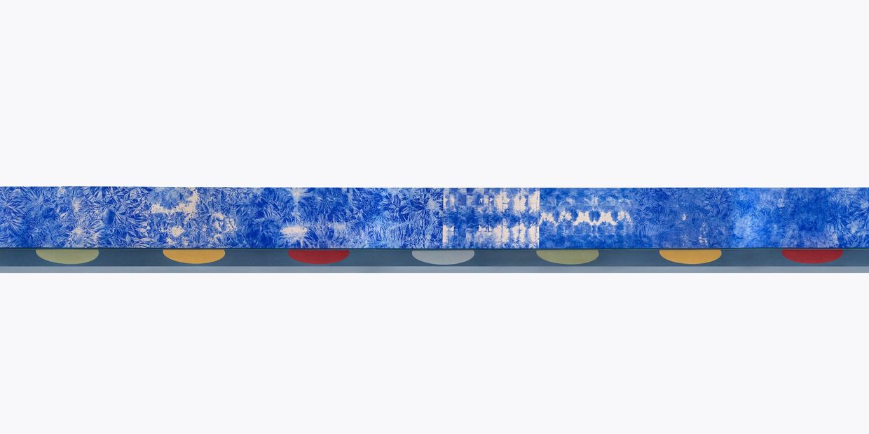 Ocean Contour captures the sensation of wave patterns and light reflected on the seabed. The work is created outdoors for extended periods of time amidst elements, and, in this case, most essentially the Ocean. Like ocean waves, the canvasses are born out of a variety of physical forces in the process of their making where the ultramarine blue pigments settle into the raw canvas folds. As part of this process, the pieces return to the source of their inspiration exposed to the changing tides as an immersive exploration at sea. Once assembled and stretched, the paintings become connecting modular units. The continuous scroll concept is influenced by the theory of art historian and critic Germano Celant whereby painting is an act of infinity rather than a distinct object. Ocean Contour combines fourteen individually composed paintings to create a site-specific wall-length installation reflecting the waves beyond.